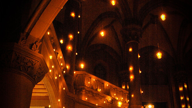 Zauberhafte Kerzenlichter leuchten aus der Höhe in den weiten Kirchenraum der Lukaskirche hinein. Die Lukaskirche erstrahlt in einem Meer von 1.000 Kerzen.