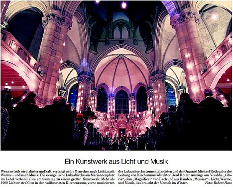 In ihrem Widerschein erklingt festliche Weihnachtsmusik für Chor und Instrumente. So entsteht ein wunderbares Gesamtkunstwerk von Licht und Klang. Die Süddeutsche Zeitung schwärmte von einem „Kunstwerk aus Licht und Musik“.
